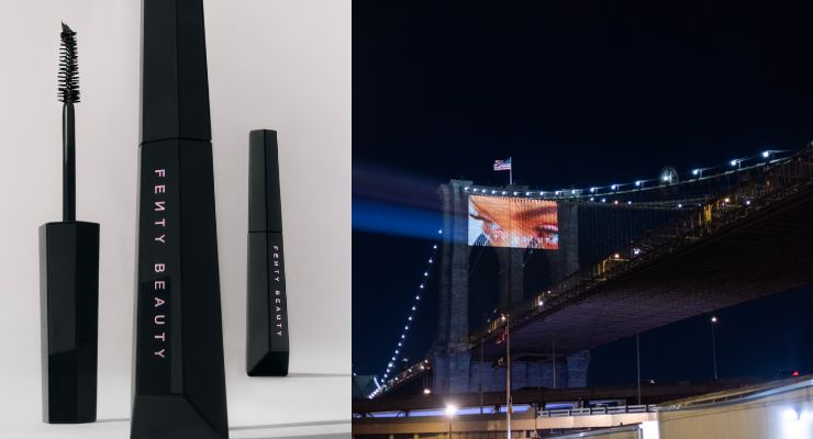 To celebrate the launch of its newest product—Hella Thicc Volumizing Mascara—Fenty Beauty transformed the city skyline and some of NYC’s most iconic landmarks Monday night with custom laser and velocity projections. A projection of Rihanna’s eyes and lashes lit up the Brooklyn Bridge, Chrysler Building, The New York Public Library, Washington Square Park, Madison Square Garden, Atomic Clock Tower, Brooklyn Museum, and many more. Shortly after, each building was then illuminated with the official reveal of Hella Thicc Volumizing Mascara, which will launch officially on March 28, 2023.